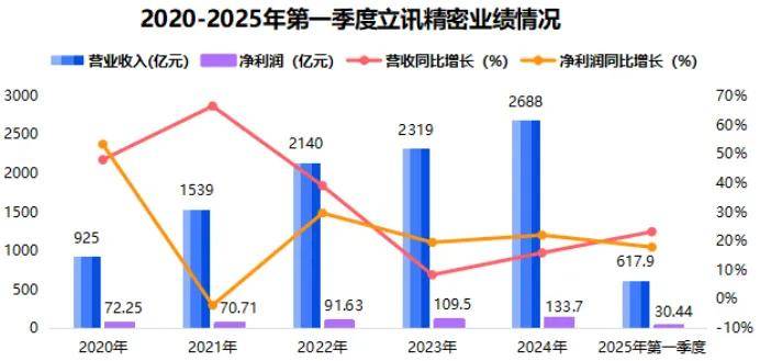 财报显示,2024年立讯精密营收达到2688亿元,同比增长15.91%;净利润133.7亿元,同比增长22.03%。其中消费电子板块占营收的83.37%,贡献了72.83%的利润。但这一核心业务的同比增速已经从2020年的57.31%下滑到2024年的13.64%。