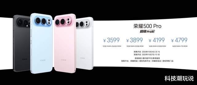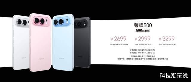 11月24日,荣耀500系列在杭州正式发布,该产品系列在“影像、性能、续航、外观、体验”等方面实现全维升级突破,重塑档位标准。荣耀500系列共两个版本,分别为荣耀500超级标准版与荣耀500超级Pro版,起售价分别为2699元、3599元,目前已经开启预售,11月27日10:00全渠道正式开售。