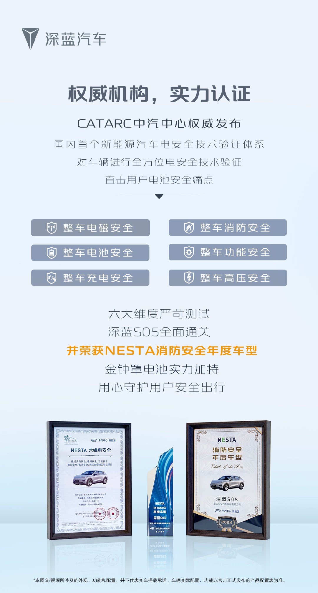 深蓝S05全系搭载宁德时代电芯、金钟罩电池,拥有高安全电芯设计、总成主动安全、总成被动安全三大安全优势,时刻保护电池,给你满满安全感,而且它不仅通过了权威机构 CATARC 中汽中心的 NESTA 六维电安全认证,还拿下了 NESTA 消防安全年度车型奖项,这份硬核的安全背书,确实值得认可。