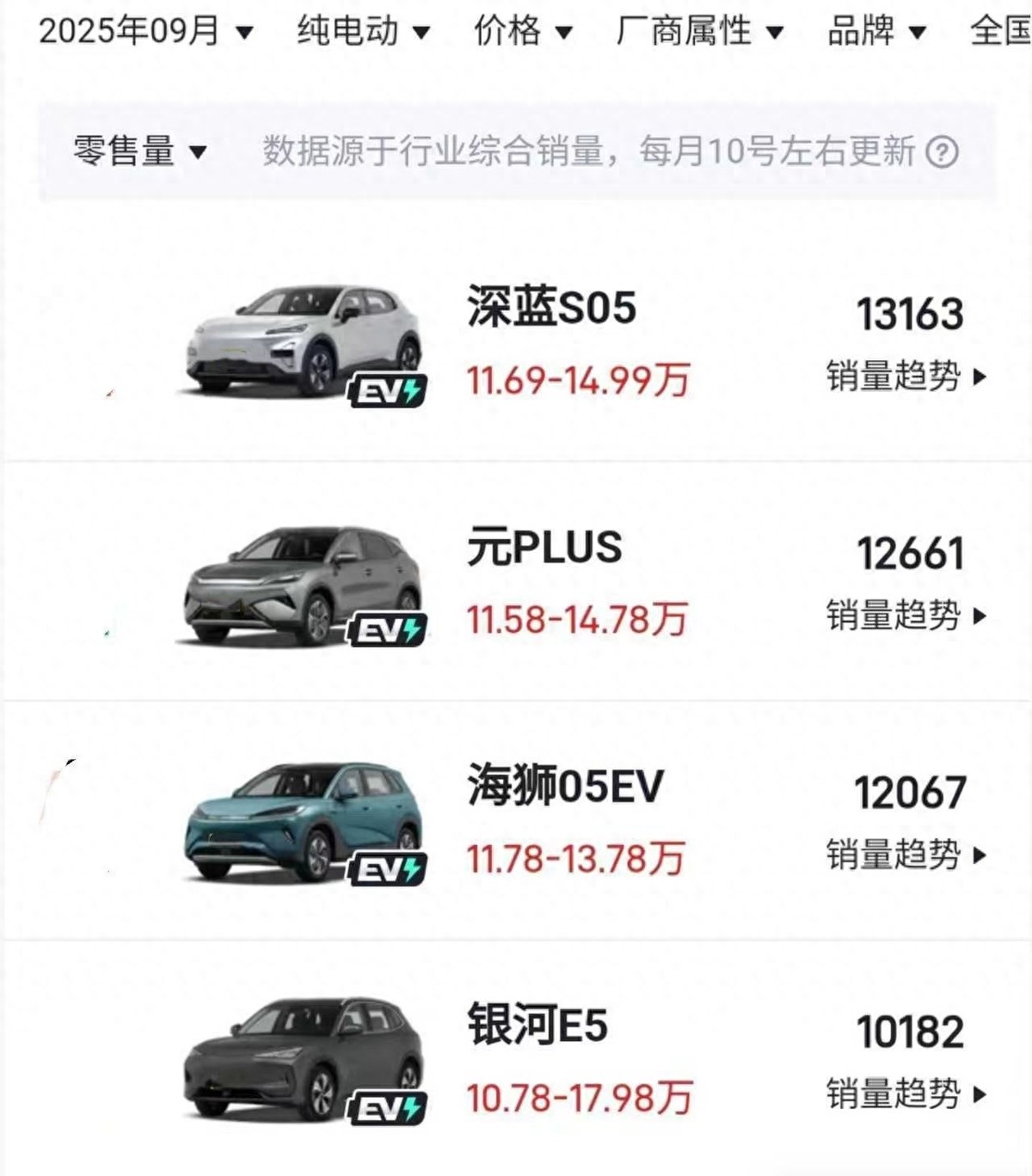 看最近的 9 月销量榜单,深蓝 S05 热销 19385 辆,其中国内 13163 辆、海外 6222 辆,直接登顶 9 月国内纯电紧凑型 SUV 销量榜首。再看同级竞品,比亚迪元 PLUS 国内卖了 12661 台,海狮 05 EV 卖了 12067 台,银河 E5 也卖了 10182 台。全新深蓝 S05 能在销量上占据明显优势,正是对它强大产品力的高度认可