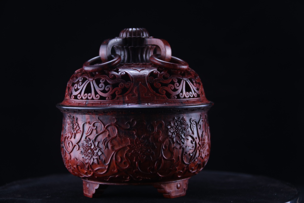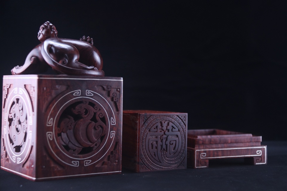 例如他的参评作品《饕餮夔龙四象印》,以印度小叶紫檀为材,整体结构复杂、纹饰繁复,既体现了古代印玺的礼仪功能,又融入了四象文化的哲学内涵。另一件作品《狻猊香薰》,则利用木材的自然形态与空洞结构,巧妙设计出香薰的烟气通道,兼具实用性与艺术性,彰显出作者对材料与功能的深刻理解。