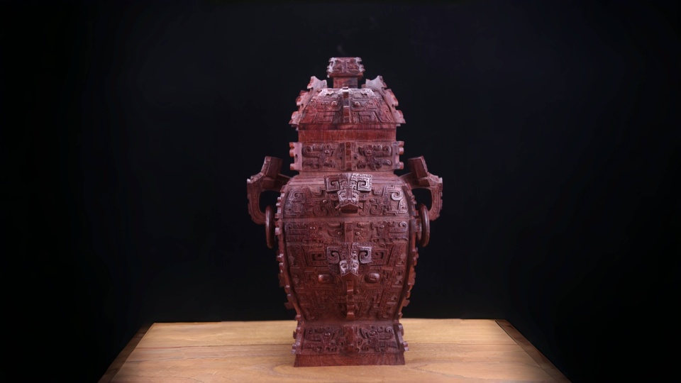 龙巍的木雕艺术最具辨识度的特点,是他将商周青铜器的形制、纹饰与木雕工艺相结合,开创了“青铜化木”的艺术风格。他擅长以印度小叶紫檀、海南黄花梨等名贵木材为材,借鉴青铜器中的饕餮纹、夔龙纹、螭虎纹等传统纹样,通过深浮雕、透雕、圆雕等技法,使木雕作品既具青铜器的庄重古朴,又不失木质的温润与灵动。