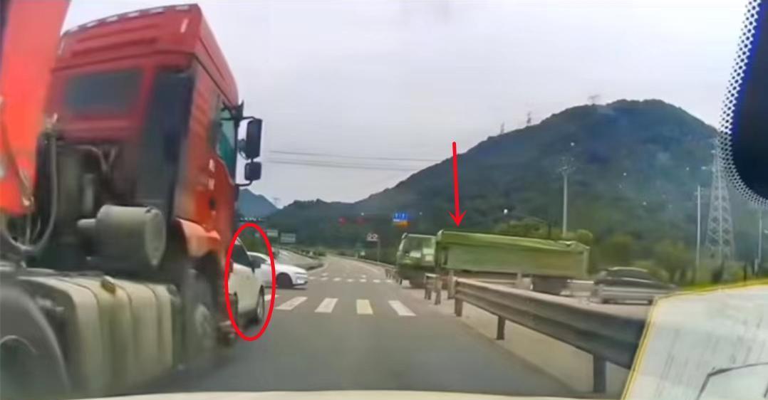 从路过司机的行车记录仪中可以得知,这起事故本来是白色小轿车遇到红灯,规规矩矩的停下车在等红灯,路一侧的绿色大货车也是在正常通行,一切看起来都是那么井然有序。