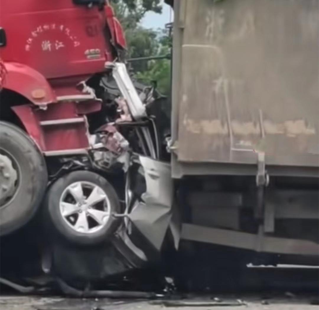 从权威媒体的通报中我们可以了解一些情况,一辆极度变形的小轿车被夹在大货车中间,破碎的不成样子,过路司机的行车记录仪记录了这场惊人的悲剧。