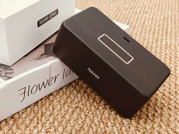 首先就是这款麦克风的充电仓设计比较大气,黑色的配色,搭配仓体前后布满的条型纹路,看似简单却又不失单调,顶部还印有NANK的LOGO,正面则是设计了四个指示灯,背部则是设计了Type-C充电口。