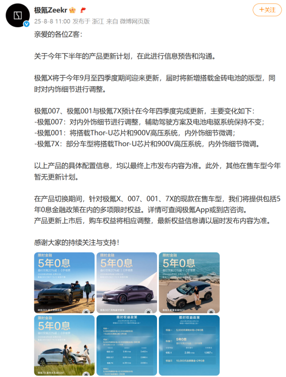 此次极氪的更新预告涉及四款车型,极氪 X 将于今年 9 月至四季度期间更新,新增搭载金砖电池的版型并调整内饰细节;极氪 007、极氪 001 与极氪 7X 预计在今年四季度完成更新,其中极氪 007 对内外饰细节调整,辅助驾驶方案及电池电驱系统保持不变;极氪 001 将搭载 Thor-U 芯片和 900V 高压系统,内外饰细节微调;极氪 7X 部分车型同样搭载 Thor-U 芯片和 900V 高压系统,内外饰细节微调。极氪明确表示,其他在售车型今年暂无更新计划。