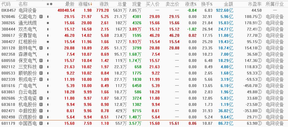 【环球网财经综合报道】2026年2月2日,A股市场电网设备板块表现抢眼,高开高走并领涨两市,盘中掀起一阵激烈的涨停潮。截至收盘,亿能电力上涨21.97%、通光线缆上涨20.00%、双杰电气上涨16.58%、安靠智电、红相股份、新特电气等多只个股涨幅超过10%。此外,森源电气、保变电气、三变科技、顺纳股份、积成电子、广电电气、白云电器、大连电瓷、杭电股份、中超控股等十余只个股纷纷封死涨停板,板块呈现出集体爆发的强势格局。
