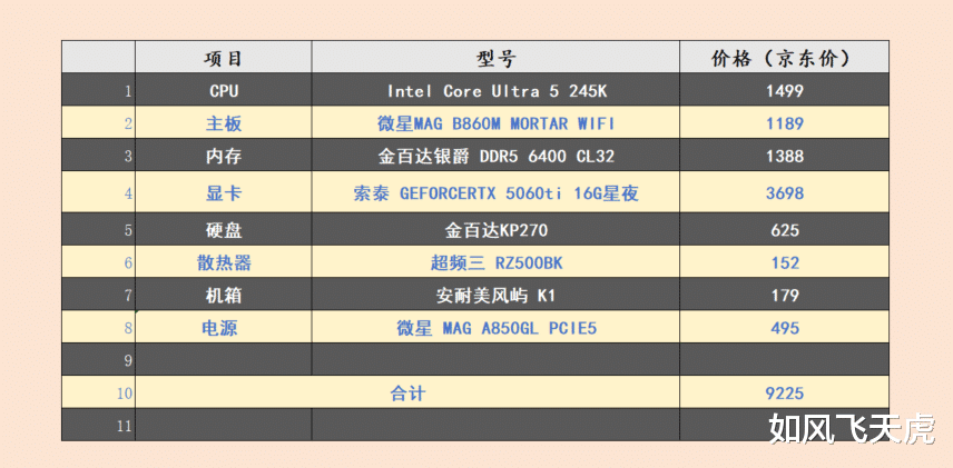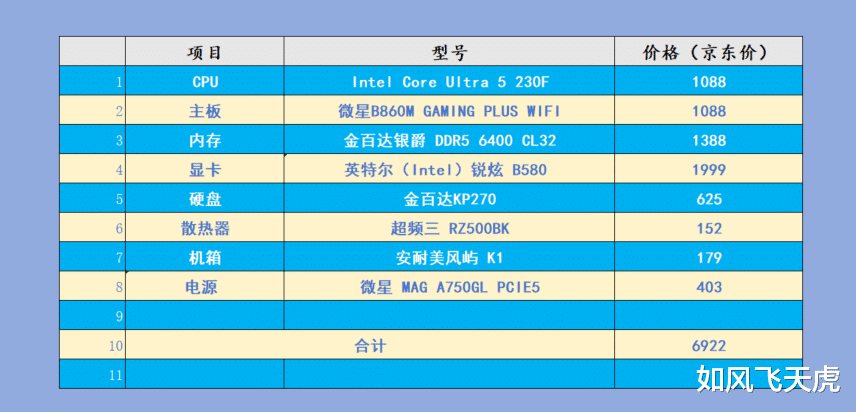 二 配置一:性价比装机,轻松畅玩2K这套配置以英特尔酷睿Ultra 5 230F为核心,搭配微星B860M GAMING PLUS WIFI主板,全方位支持2K游戏体验和生产力。在内存价格飞涨的今天,依旧可以将总价(按京东价格计)控制在7K以下,性价比很高。