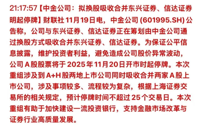中金公司、东兴证券、信达证券同时发布停牌公告,宣布筹划由中金公司换股吸收合并后两家券商。预计停牌不超过25个交易日。面对这种利好,券商当然得高开低走了: