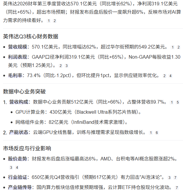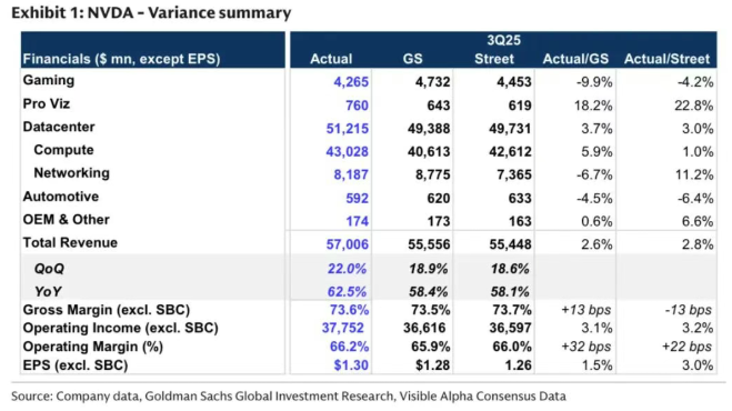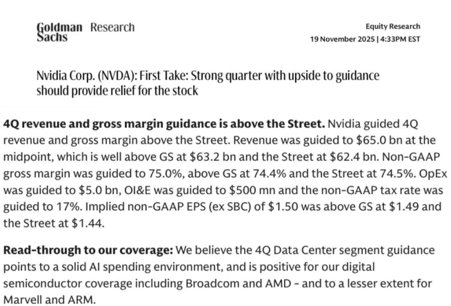 核心观点鲜明:“Nvidia reported revenue of $57.0 bn, well above GS at $55.6 bn”(英伟达录得570亿美元营收,远超高盛预期的556亿)。不仅如此,Q4指引更以650亿美元的营收远超市场预期,令投资人惊艳。高盛特别提到英伟达近期给出2026年数据中心5000亿美元收入目标,对AI基础设施投入持续看好,并表示:“We believe the 4Q Data Center segment guidance points to a solid AI spending environment”(我们认为第四季度数据中心业务指引暗示AI支出环境稳健),预示着AI产业链如Broadcom、AMD等公司将显著受益:
