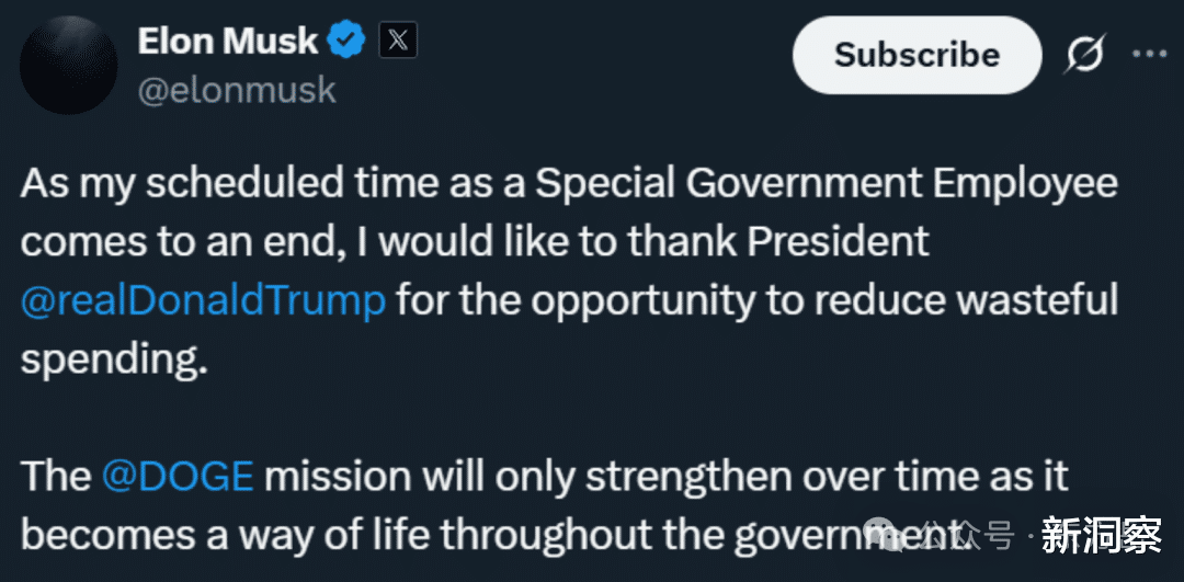 当地时间5月28日,马斯克在社交平台X上发帖宣布,他作为“特殊政府雇员”的任期即将结束,他将正式离开特朗普政府。
