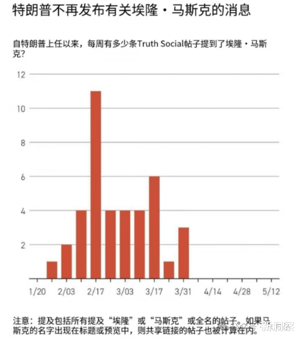 有人统计,4月份后,特朗普在社媒上再不提马斯克的名字了。