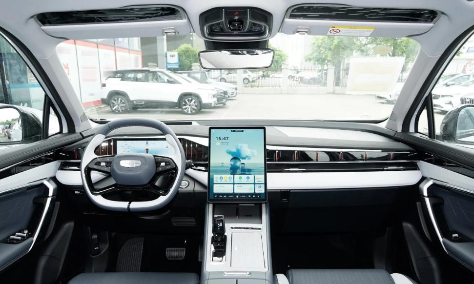 内饰方面, 新博越L的科技感营造得比较到位。 10.25英寸的全液晶仪表盘和13.2英寸的中控大屏, 显示效果清晰, 操作也比较流畅。 车内采用了大量的软性材质包裹, 提升了整体的质感。 值得一提的是, 新博越L全系标配了高通骁龙8155芯片, 这颗芯片的性能非常强悍, 可以保证车机系统的流畅运行。 而且, 新博越L还配备了吉利最新的Galaxy OS Air车机系统, 功能丰富, 操作便捷。