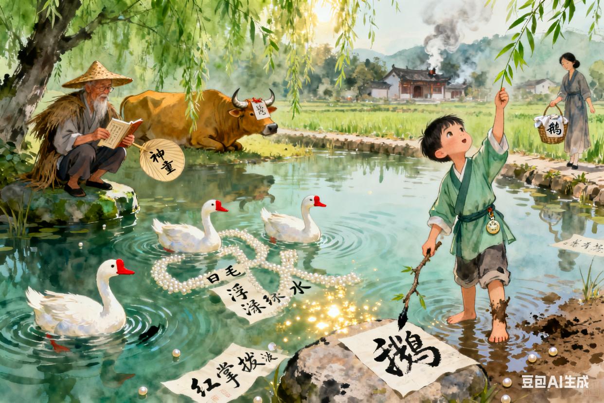 那是永徽元年,骆宾王才七岁。祖父是当地的老儒,每天教他读《诗经》。那天午后,祖父带他去池塘边看鹅,雪白的鹅浮在绿水间,红掌拨着清波,好看得紧。祖父笑着问 “你能为这鹅写几句诗吗?” 他眨了眨眼,没多想,就念出 “鹅,鹅,鹅,曲项向天歌。白毛浮绿水,红掌拨清波”。祖父听完,把他抱起来,笑得胡子都翘了,说 “我家宾王,是块写诗的料”。可没人知道,他后来在私塾里,为了把 “浮” 字改得更贴切,蹲在池塘边看了一下午鹅,直到夕阳把水面染成金红色,才确定 “浮” 字比 “漂” 字更软,更配得上鹅的白毛。