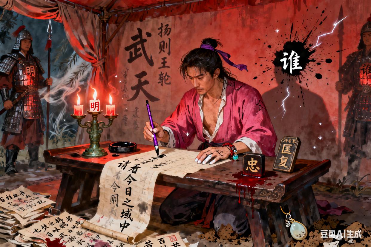 到了扬州,徐敬业见他来了,高兴得亲自出门迎接。帅帐里,烛火通明,徐敬业把檄文的草稿递给骆宾王,说 “这檄文,得你来写,才能写出咱们的气势”。骆宾王接过草稿,看了几眼,就把它推到一边,说 “我重新写,要让天下人都知道武则天的罪行”。他拿起那支旧笔,蘸了墨,就写了起来。写 “伪临朝武氏者,性非和顺,地实寒微” 时,笔走龙蛇,墨汁都溅到了纸上;写 “请看今日之域中,竟是谁家之天下” 时,他猛地一拍桌子,烛火都晃了晃 —— 他觉得心里的话,终于能说出来了,像憋了多年的洪水,终于冲开了闸门。