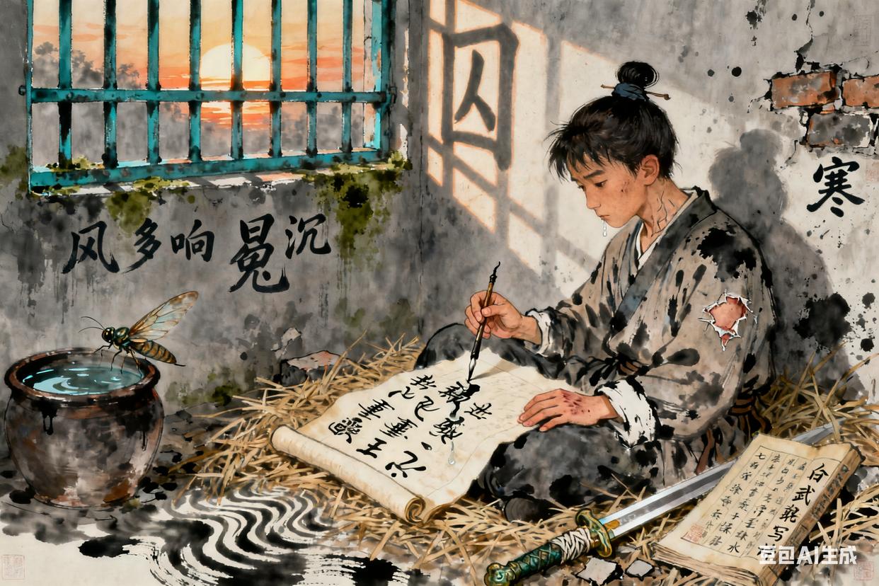 仪凤三年的长安,暑气裹着尘土,往牢狱的铁窗里钻。四十二岁的骆宾王靠在潮湿的墙壁上,囚衣的袖口蹭着地面 —— 那里浸着片墨痕,是昨夜写《在狱咏蝉》时,不慎打翻砚台染的。他抬手摸了摸那墨痕,粗糙的布料磨得指腹发疼,就像他这半生的路。窗外的老槐树上,蝉正拼命地叫,声嘶力竭的,倒比狱卒的呵斥还刺耳。他盯着铁窗格子里漏进来的阳光,忽然想起七岁那年在义乌的池塘边,也是这样的蝉鸣,他张口就吟出 “白毛浮绿水”,祖父手里的蒲扇都停了。