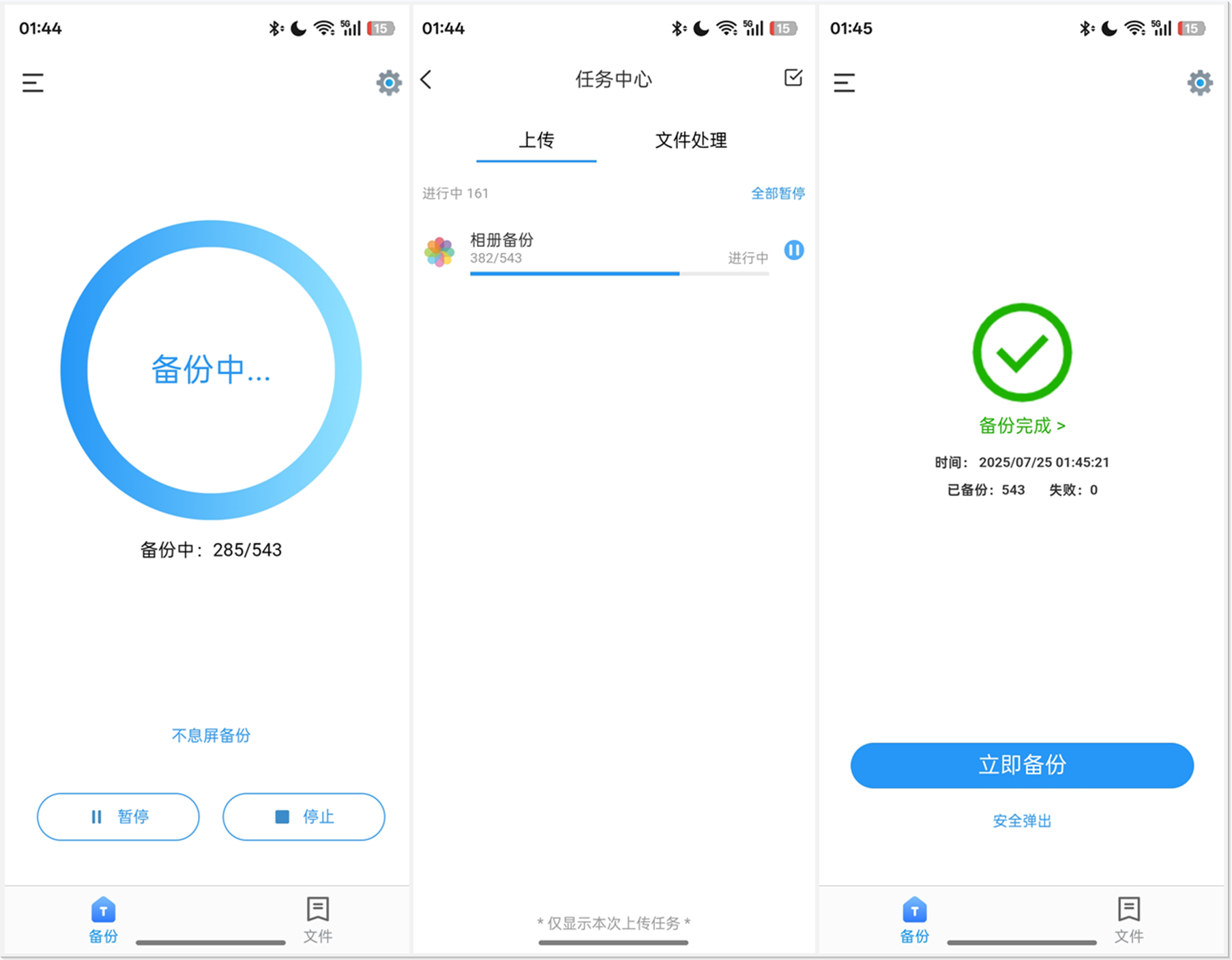 ▼手机App极致简洁,将备份项分为相册备份和文件备份两类。