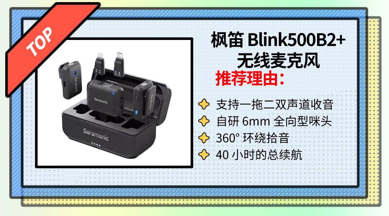 主打多人创作场景的枫笛 Blink500B2+,支持一拖二双声道收音,能分别收录两个人的声音,为后期剪辑提供了更多灵活性,适配访谈、双人互动等多种多人创作场景。它采用自研 6mm 全向型咪头,360° 环绕拾音,能收录到清晰细腻的人声,听感通透无多余杂音;2.4G 数字传输技术抗干扰性强,信号连接稳定,不用担心断连问题。机身设计轻盈便携,收纳方便,还能兼容手机、相机、电脑等多种设备,场景适配性极强;40 小时的总续航,更是能轻松满足全天拍摄需求。