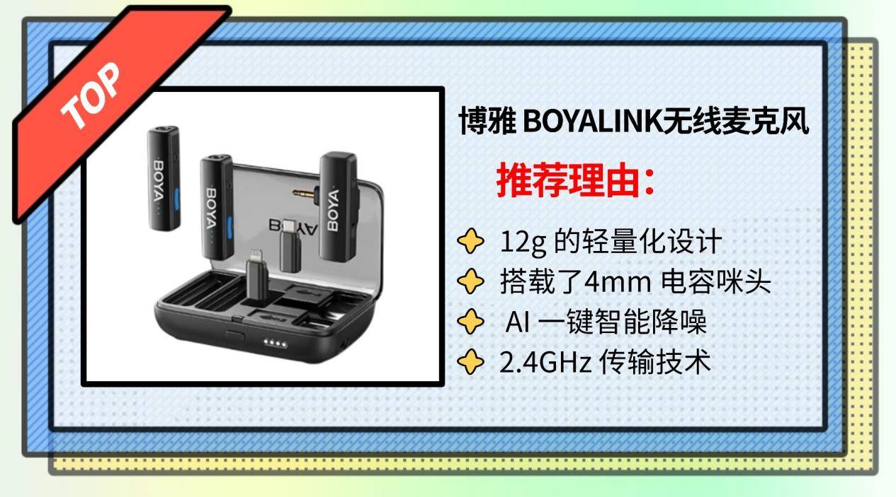 对于夏天爱穿轻薄衣物,又想拥有一款隐蔽性强、佩戴舒适的无线麦克风的创作者来说,博雅 BOYALINK 无疑是理想选择。它仅 12g 的轻量化设计,夹在衣领上隐蔽不突兀,还不会压垮轻薄面料,佩戴体验十分舒适。配置上,4mm 电容咪头搭配 AI 智能降噪 + 一键主动降噪,能有效过滤各类杂音;2.4GHz 传输技术支持 100 米开阔环境稳定连接,几乎不会断连;30 小时的总续航足以满足长时间拍摄,Type-C 和 Lightning 双接口设计,即插即用,适配各类主流设备。
