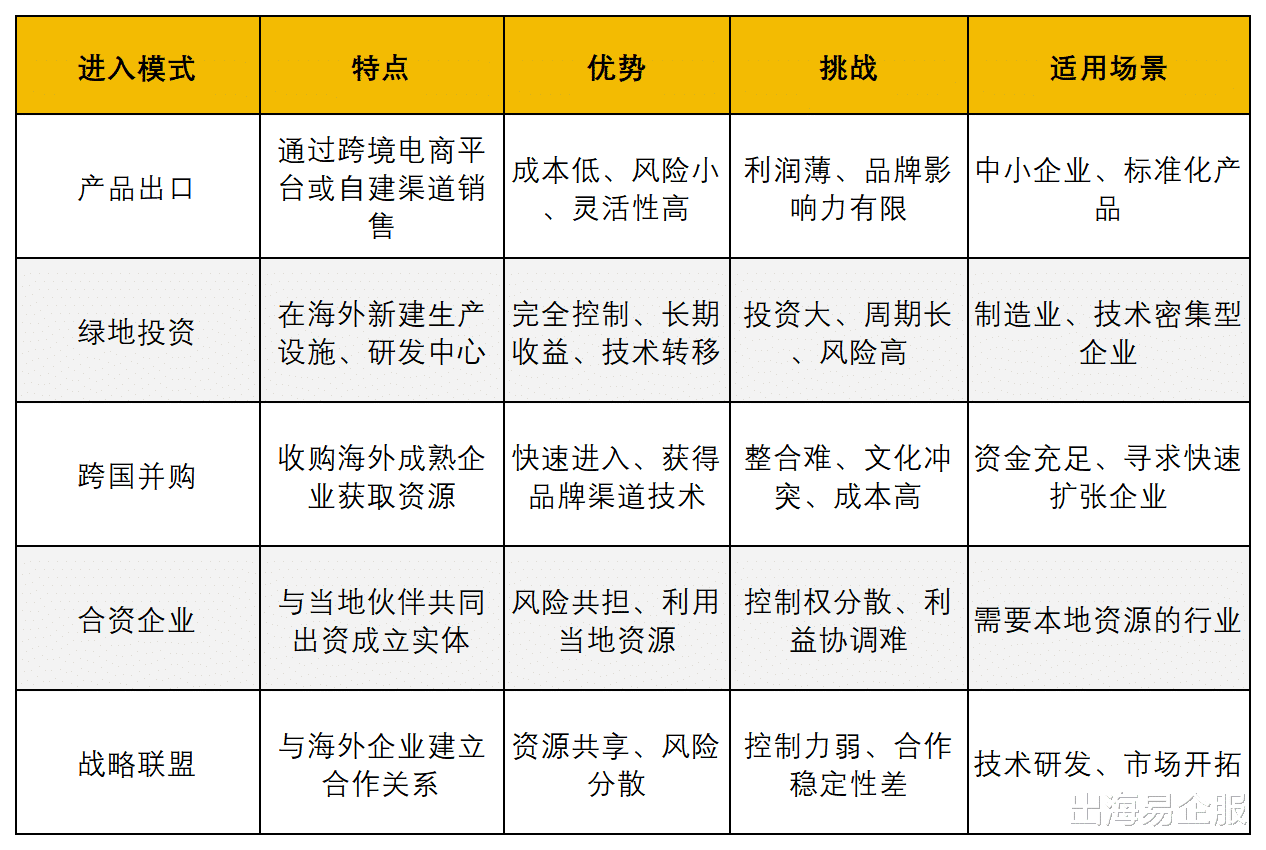 03出海策略与风险管理中国企业出海的市场进入策略呈现多元化特征。主要模式包括: