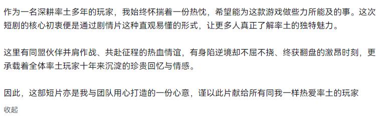 正如简介所言:“作为一名深耕率土多年的玩家,我始终怀揣着一份热忱,希望能为这款游戏做些力所能及的事。这次短剧的核心初衷便是通过剧情片这种直观易懂的形式,让更多人真正了解率土的独特魅力。”