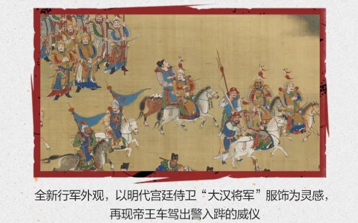 设计团队从明代宫廷“大汉将军”的甲胄与仪仗中汲取灵感,打造全新行军外观,让玩家的部队在战场上踏出“帝王车驾”般的威仪感。