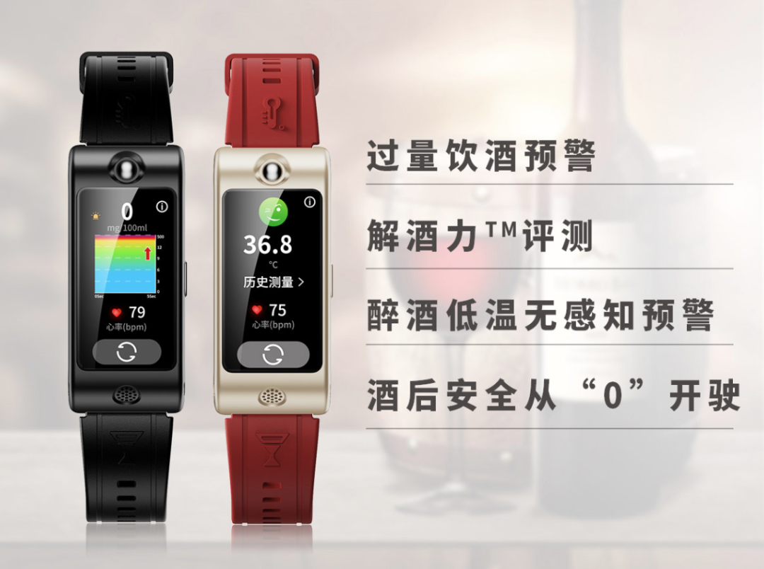 这款手表的核心技术在于其搭载的燃料电池型MEMS电化学酒精传感器,通过呼气中的酒精分子与传感器的氧化还原反应产生电流信号,精准测量体内酒精浓度,并在酒精含量超标时及时预警。