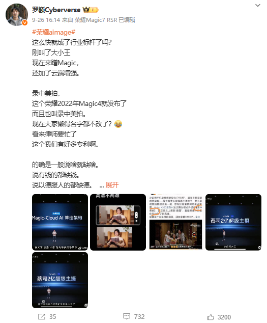 “刚叫了大小王现在来蹭 Magic,还加了云端增强。” 罗巍在配文中言辞犀利,直言 vivo 连功能名称都未改动,并强调荣耀在该功能领域已布局多项专利,将通过法律途径维权:“看来律师要忙了,这个我们有好多专利啊”。在后续评论中,他更以排比句式暗讽行业乱象:“说有钱的都缺钱,说以德服人的都缺德,说本分的都不本分”,虽未直接点名,但指向性明确。
