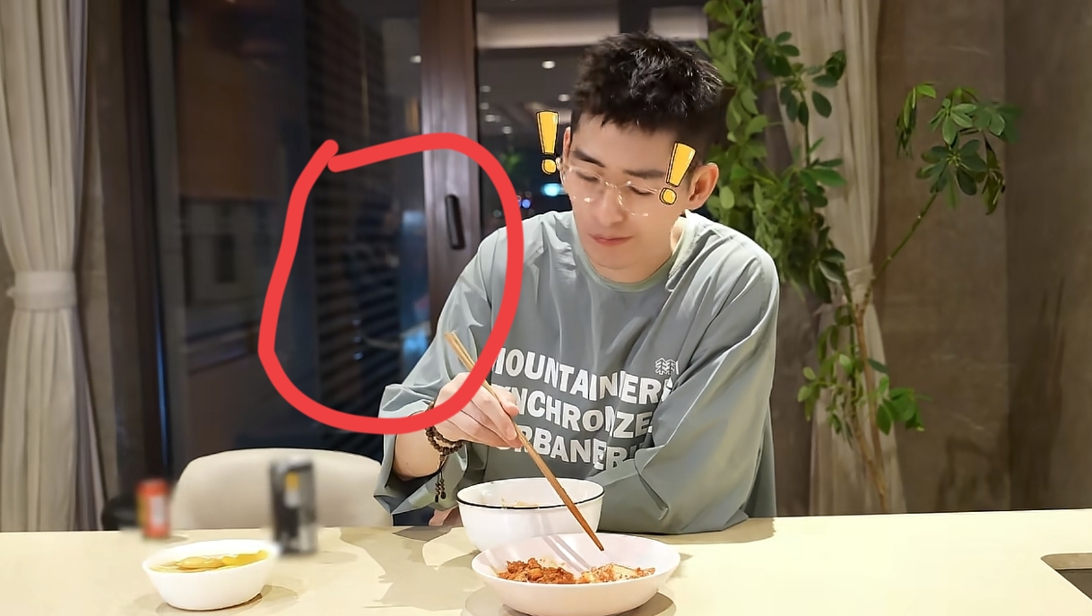 张翰吃饭的时候,工作人员的镜头对准了他,而他的身后是一面能照出人影的玻璃,从玻璃倒影上,看到了一名身材火辣的年轻美女。