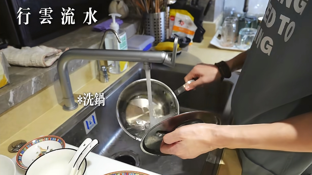 不过镜头移到洗菜盆处时,生活气息就变得非常浓重了,不锈钢的筷子筒,已经用掉半瓶的洗洁精,有些旧了的抹布都彰显着主人经常使用这些东西。
