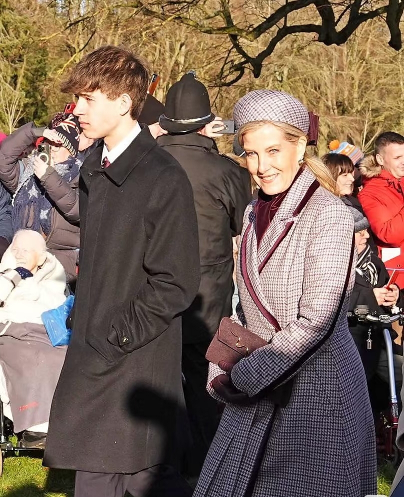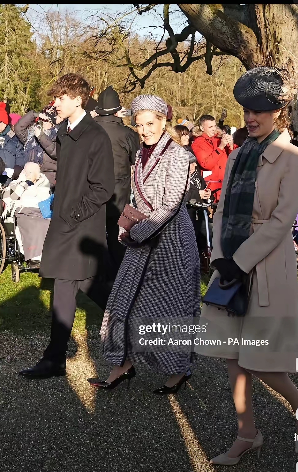 不过要说最亮眼的存在,还得是爱丁堡公爵一家,苏菲王妃身穿一件格纹大衣,脚踩酒红色高跟鞋,搭配一顶小礼帽,造型简单又不失时尚。