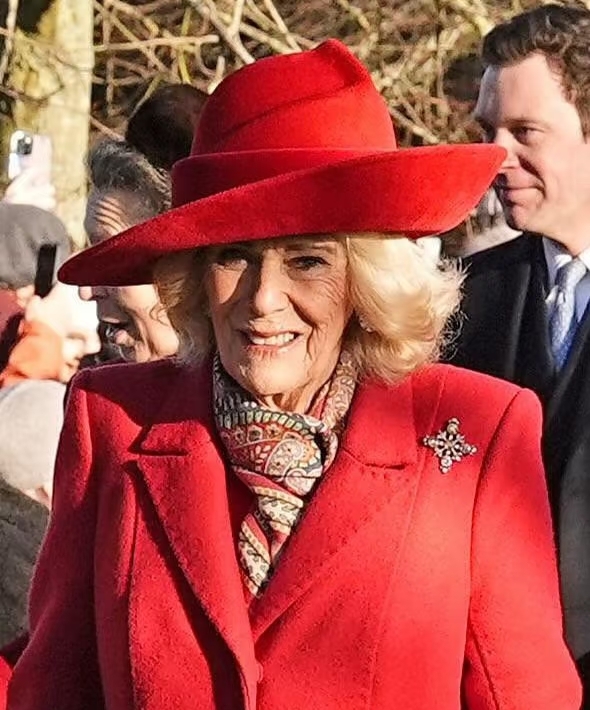 78岁的卡米拉王后,选择了一件相当亮眼的大红色外套,搭配一顶同色系宽帽沿礼帽,也是很有圣诞氛围了。