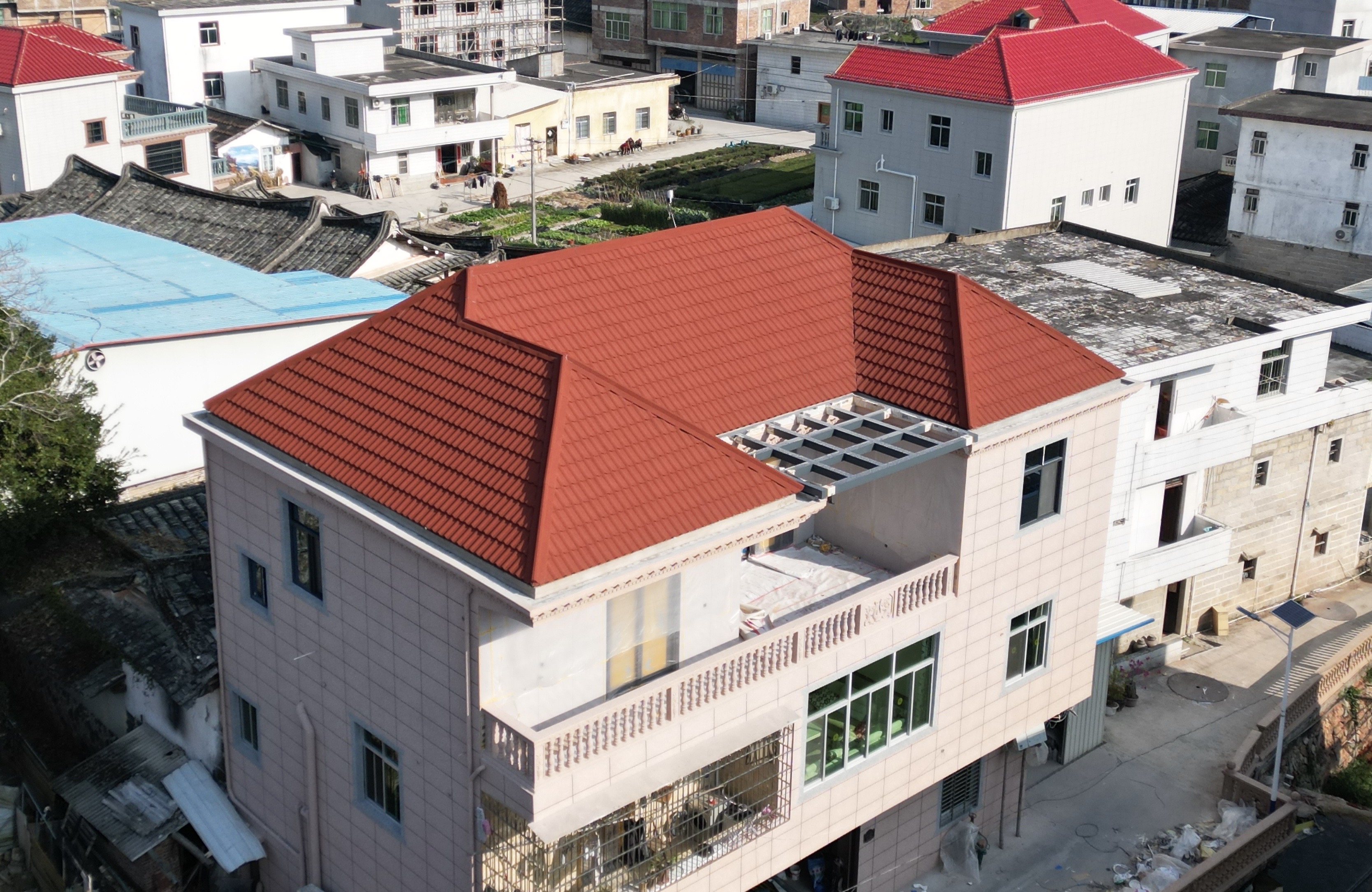 普通家庭自建房或老房翻新,屋顶承重有限。水泥瓦每平米45公斤、琉璃瓦38公斤;彩石瓦仅5-7公斤,不用加固,施工3天就能完工,干法作业省时间。