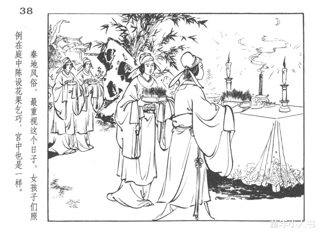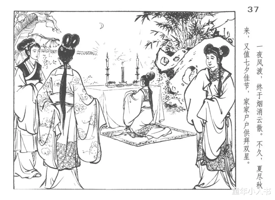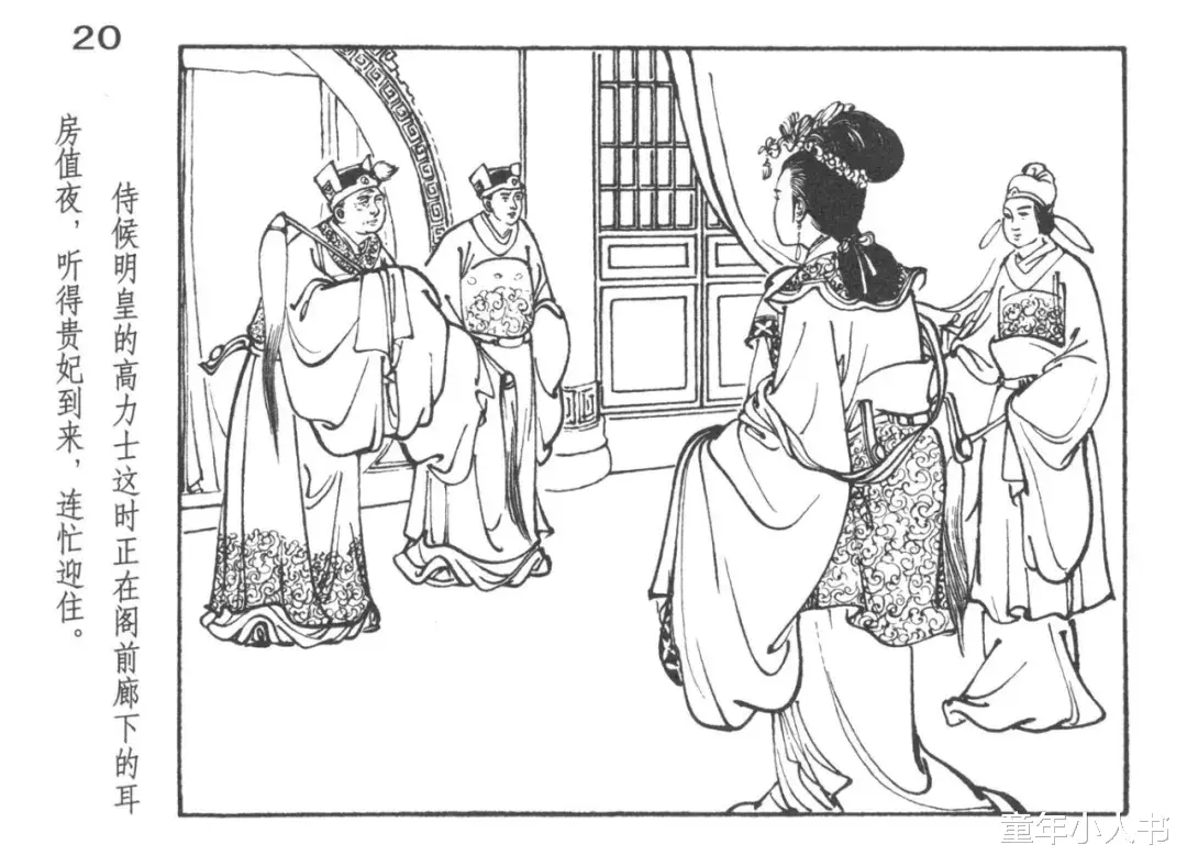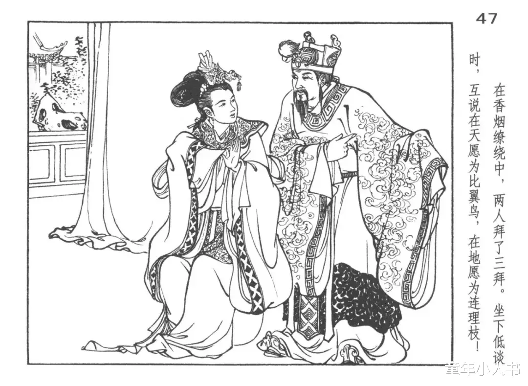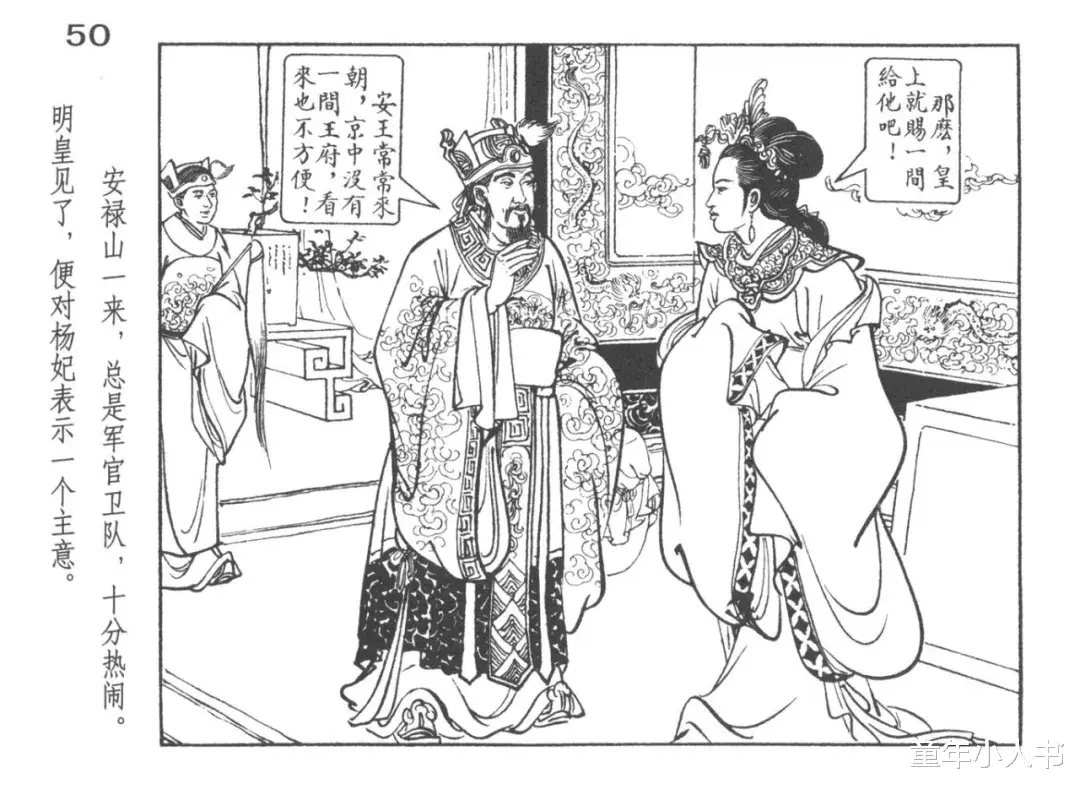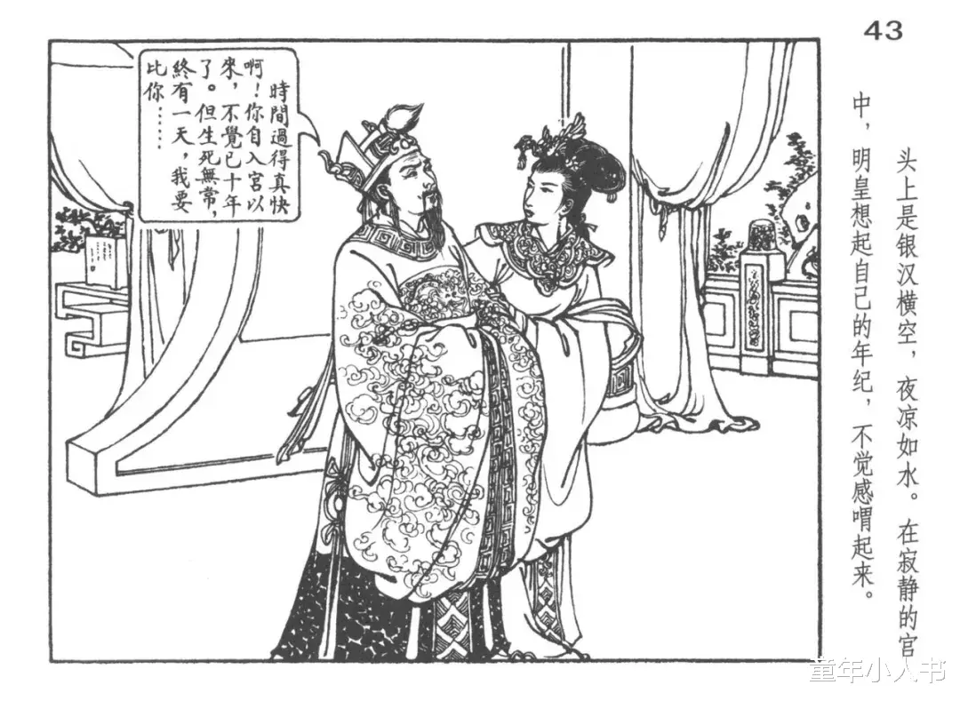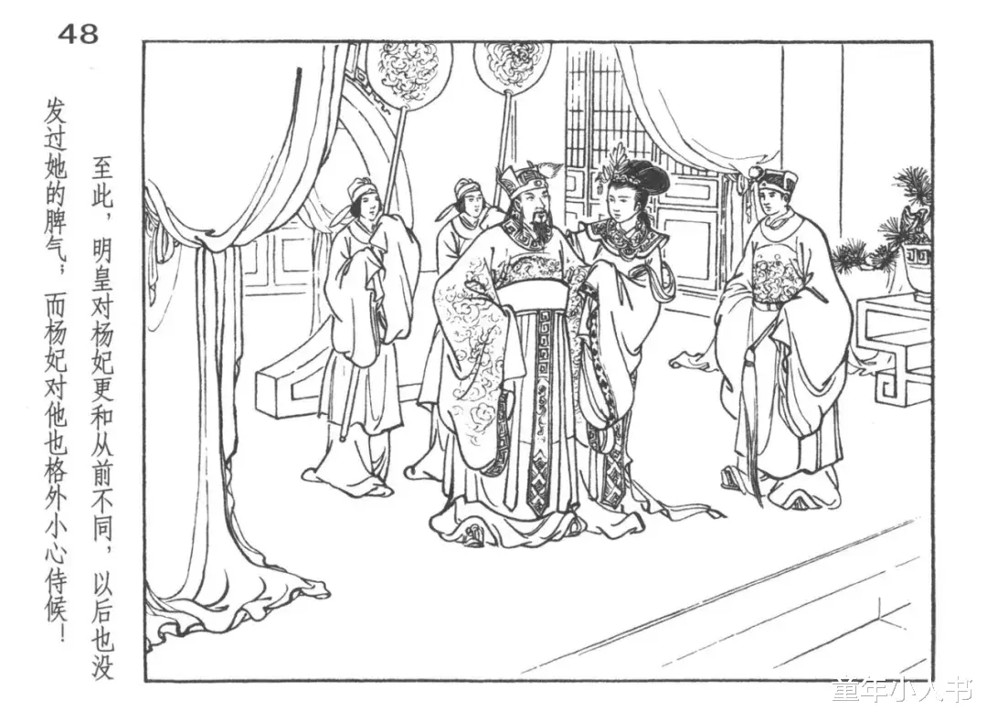 在翠华阁赏梅的明皇触景生情,让他想起了梅妃,在杨贵妃入宫之前,梅妃颇得明皇宠爱,如今却被疏远,明皇也有几分感慨,于是派人召见梅妃来翠华阁一聚。一日未见明皇的杨贵妃打听到明皇居然与梅妃在一起,一气之下来到翠华阁,她彻底触怒了明皇,后悔不及,百般求情才得到明皇谅解。七夕之夜,明皇拉着杨贵妃一起跪下设誓,表达了彼此永不分离的情感。“七月七日长生殿,夜半无人私语时”。其实除了杨贵妃之外,明皇最宠信的便是安禄山了,可安禄山对明皇有着自己的计谋。“在天愿作比翼鸟,在地愿为连理枝。”终究还是逃不过马嵬坡时的悲剧,杨贵妃此时的荣宠,最终被迫赐死,那一刻,一个帝王失去挚爱,悲痛萎靡的龙颜,也昭示着盛唐气象的彻底崩塌。敬请欣赏今天的连环画故事《长生殿》,明天将继续分享下期精彩《渔阳鼙鼓》。