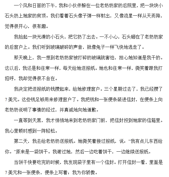 (2)当饼干快要吃完的时候,我发现袋子里有一个信封。打开信封一看,里面是7美元和一张便条,便条上写着:我为你骄傲。