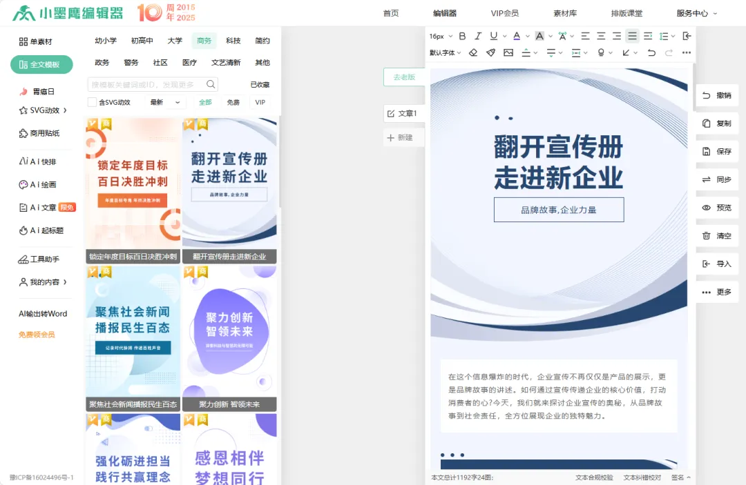 对于这个需求,完全不需要从零开始自己设计。最有效的方法,是借助小墨鹰编辑器这样工具里现成的高质量模板和素材。