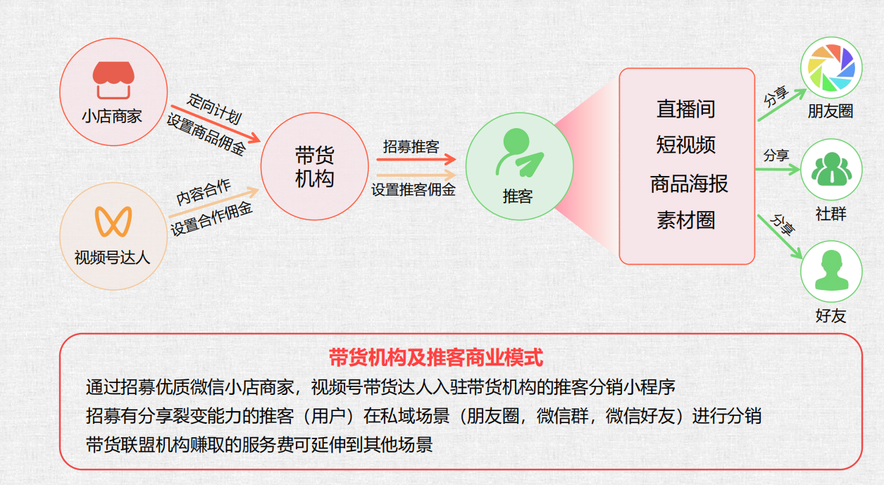 用户(推客):零门槛接入系统,通过小程序可视化佣金明细、提现进度查询、选品库推荐功能,降低变现难度。