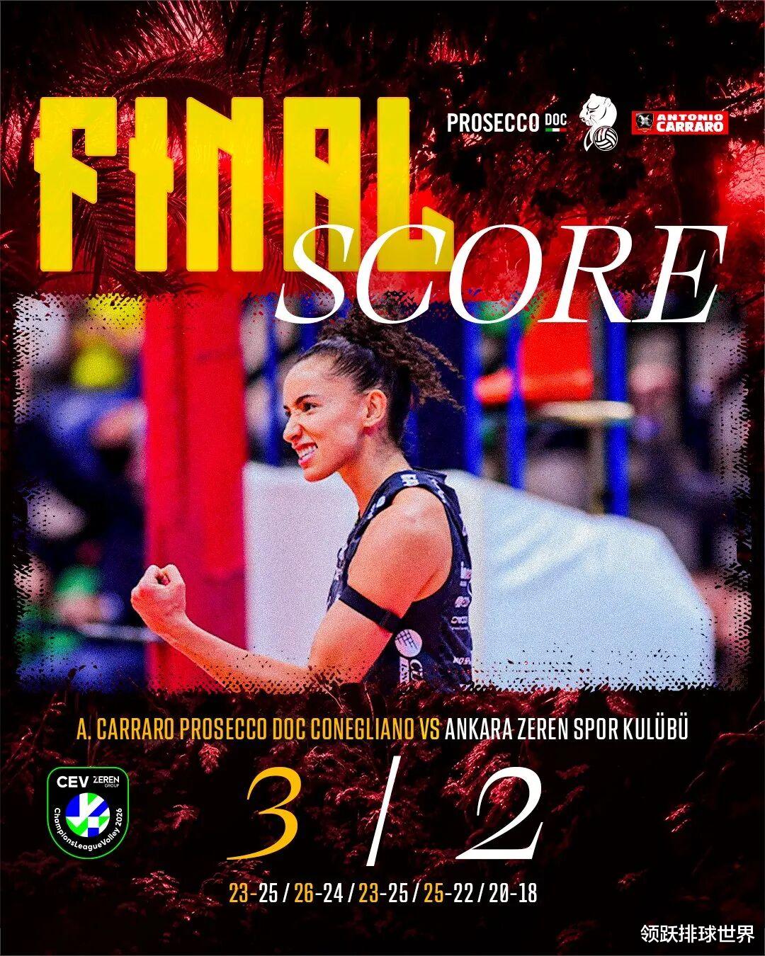 北京时间11月26日凌晨,2025-2026赛季欧冠女排第四轮首回合在意大利特雷维索燃起战火,卫冕冠军科内利亚诺女排迎来了本赛季欧冠的首秀,面对土耳其劲旅泽伦体育女排,这场比赛不仅是强强对话,更是一场惊心动魄的拉锯战。全场耗时138分钟,五局鏖战,决胜局多次易边,最终科内利亚诺女排在主场以3-2(23-25、26-24、23-25、25-22、20-18)惊险取胜,拿下开门红。