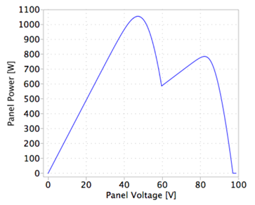 光伏模块由三个这样的子串串联组成。每个子串都有一个旁路二极管。假设太阳辐射(输入G)和温度(输入T)在每个子串中是均匀的。在部分阴影的情况下,每个子串上的辐照度是不相等的,这减少了被阴影子串产生的电流的大小。在没有旁路二极管的情况下,这可能会导致反向电流和在阴影电池中的功率损耗。旁路二极管允许被阴影和未阴影子串产生的电流之间的差异通过旁路二极管流动,并避免了在阴影电池中的反向电流和功率损耗。