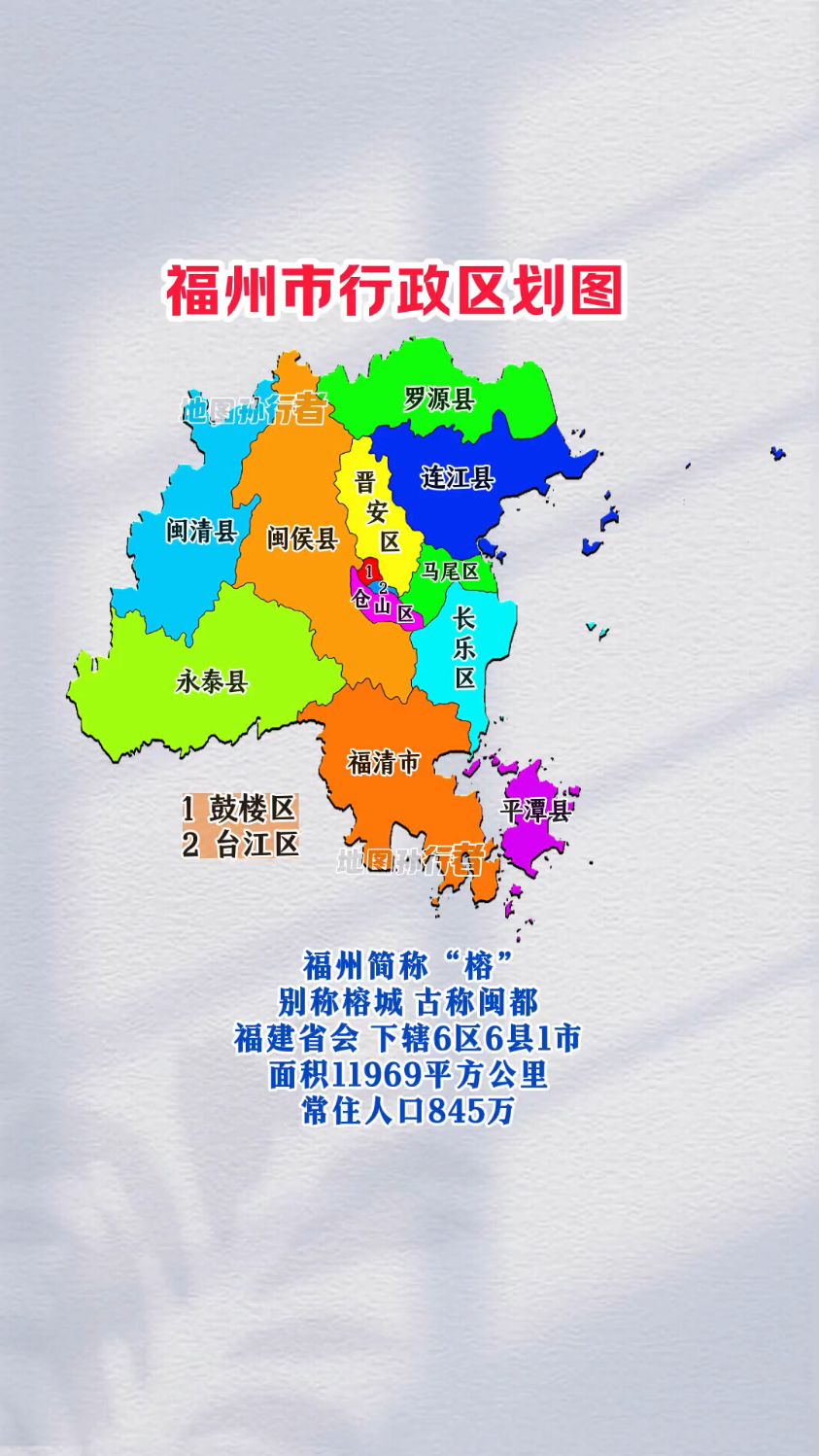 福州面积有1.2万平方公里,森林覆盖率58.41%(全国省会第2), 辖6区6县1市,常住人口844.8万 。