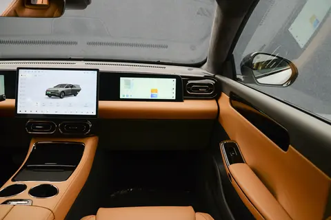 进入车内,先映入眼帘的是三块大型液晶屏,分别是10.25英寸的全液晶仪表盘、14.6英寸的中控主屏,以及10.25英寸的副驾娱乐屏。刚开始还担心这么多屏幕会不会显得繁复且华而不实,但实际使用后发现恰恰相反,它们带来的便利性和实用性很明显。仪表盘信息显示清晰明了,尤其是车速、电量、电耗等关键数据一目了然,驾驶时不用分心查找。中控屏反应灵敏,操作流畅,导航、音乐及其他常用功能布局合理,找起来轻松便捷。副驾屏则是一大亮点,家里人坐副驾时可以看电影、玩游戏,长途出行时能大幅减少无聊感,又不会影响司机操作中控屏,实现了非常贴心的分区娱乐体验。这个设计显然考虑到了家庭成员的多样需求,充分体现了人性化。