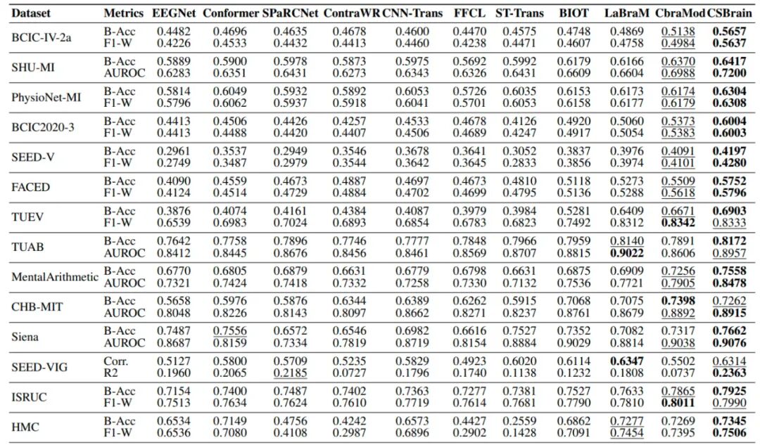 结果显示,CSBrain 在几乎所有任务和评估指标上均达到了当前最强性能。在 11 项任务的平均结果中,相较于当前 SOTA 模型实现 3.35% 的整体性能提升。