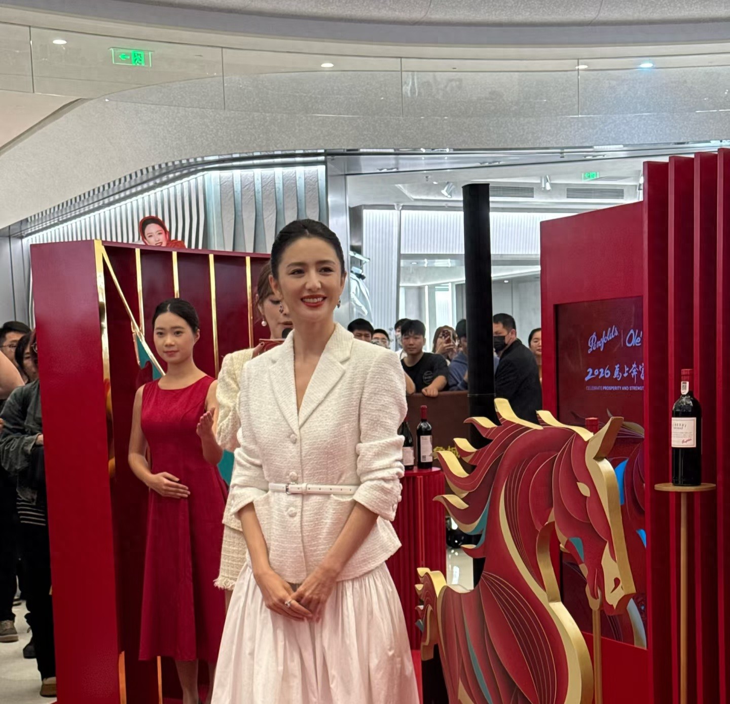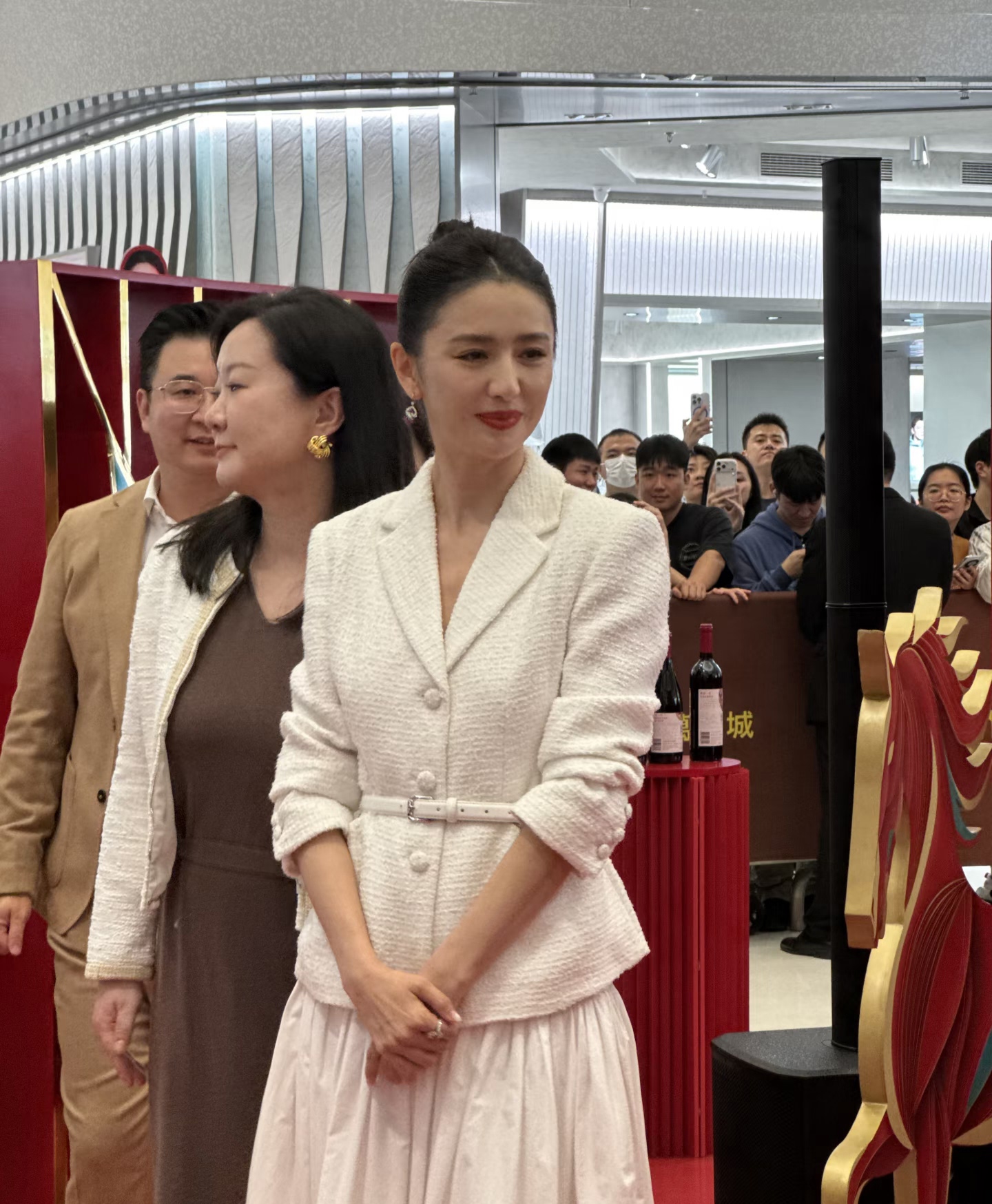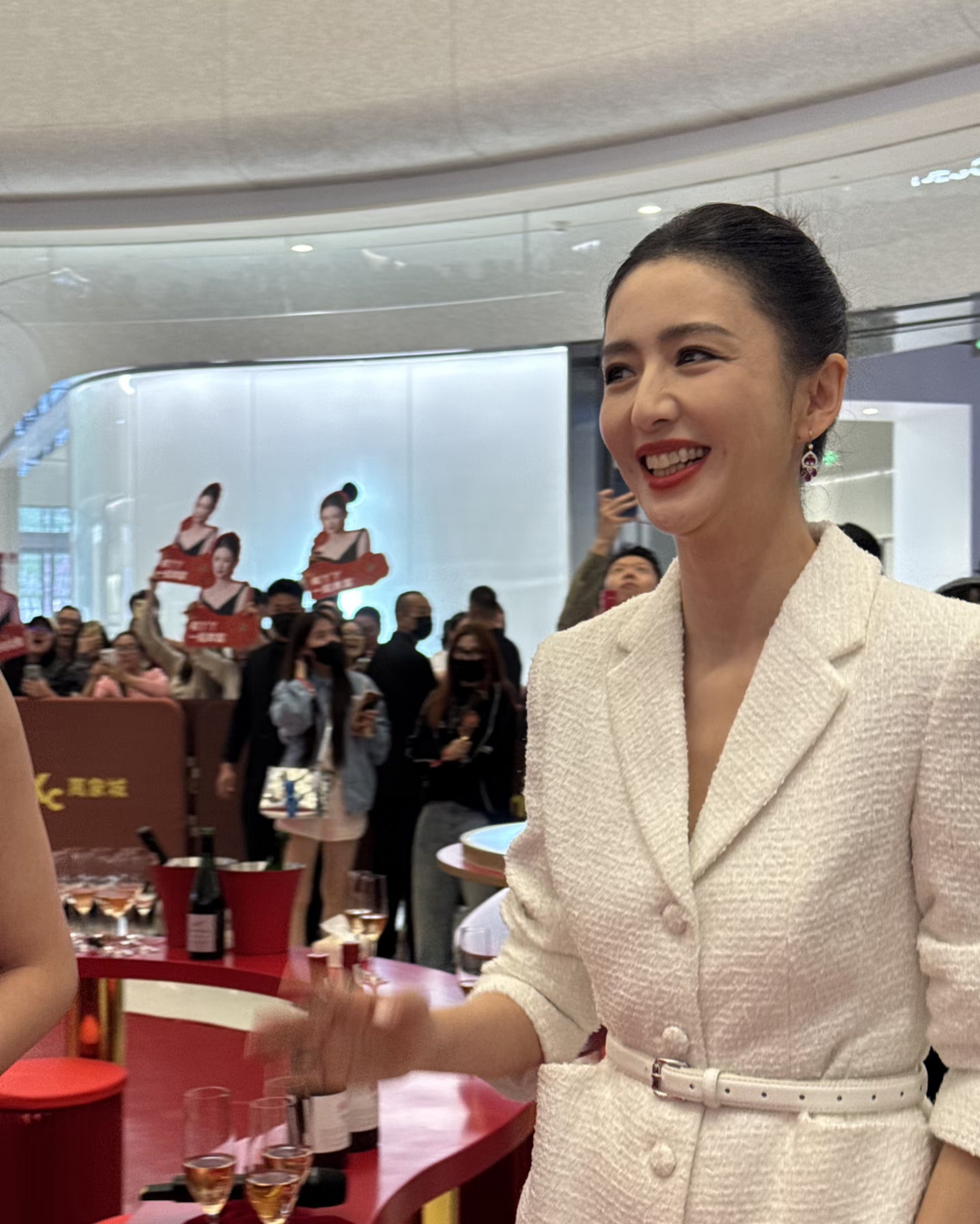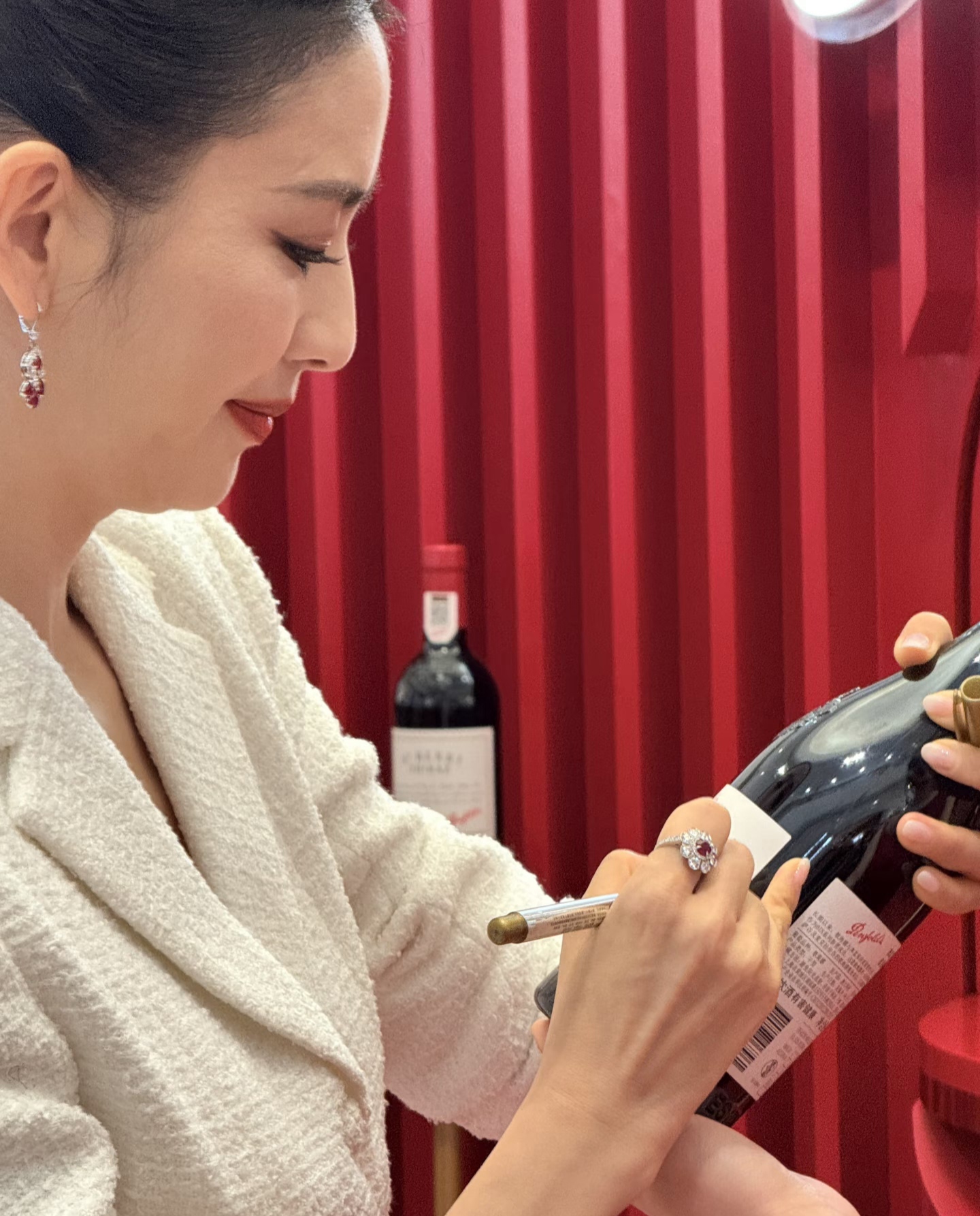 佟丽娅今天是出席了一个红酒品牌的宣传活动, 她穿了一身白色小香风的裙子,戴了红宝石耳环和戒指,整个人优雅又贵气。