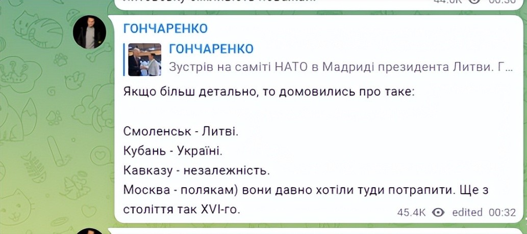 其中最引人注目的就要数他与立陶宛总统之间的交谈了。贡恰连科发帖称:“更详细地说,我们就以下内容达成了一致:斯摩棱斯克归立陶宛;库班归乌克兰;(俄罗斯)高加索地区独立;莫斯科归波兰,自从16世纪以来,他们就想得到那里。”也就是说,这位乌克兰代表荒唐地提议由乌克兰、立陶宛和波兰三国“瓜分”俄罗斯领土。