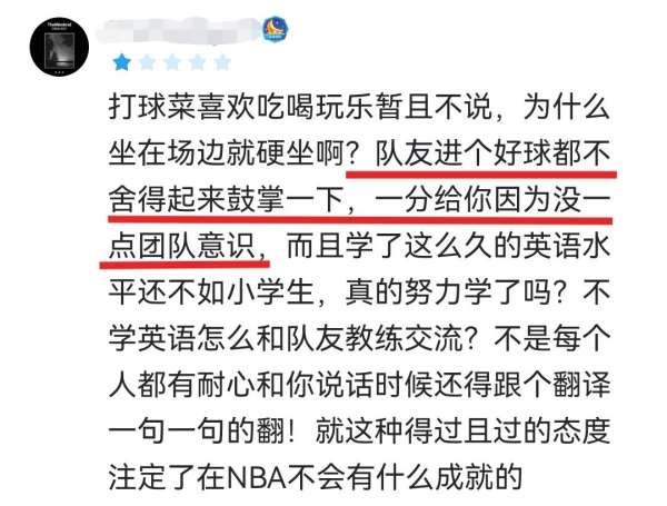 还有网友喷杨瀚森时谈到:“队友进个好球都不舍得起来鼓掌一下,一分给你因为没一点团队意识”