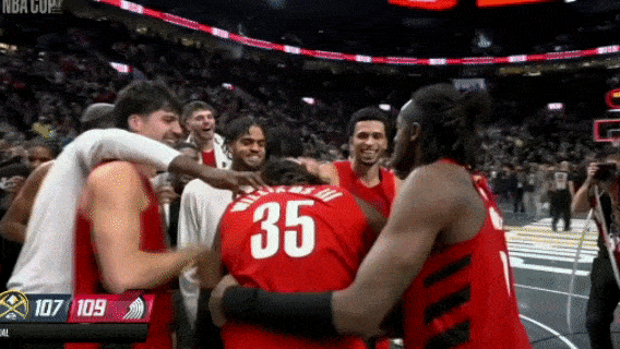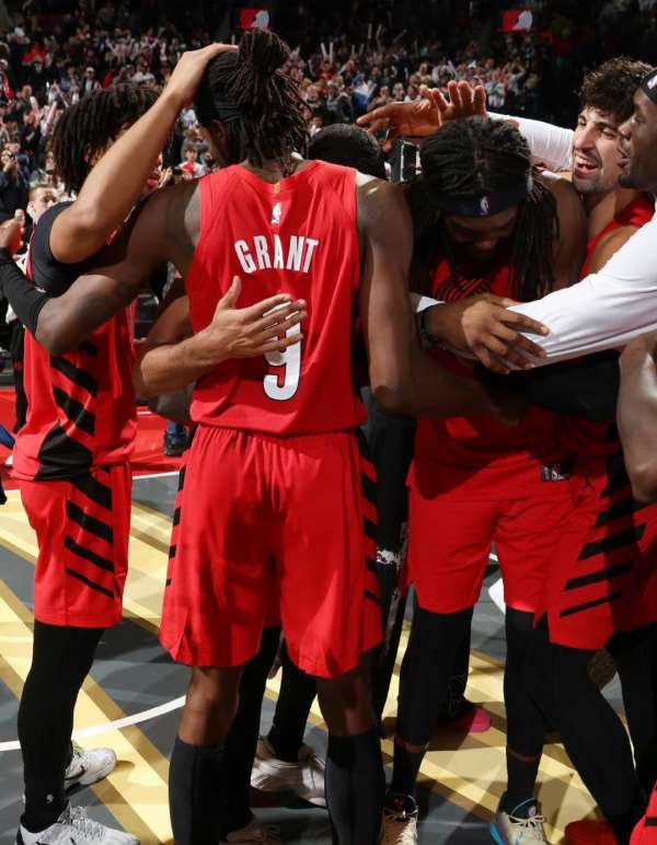 比赛结束,开拓者球员把格兰特围在中间疯狂庆祝。
