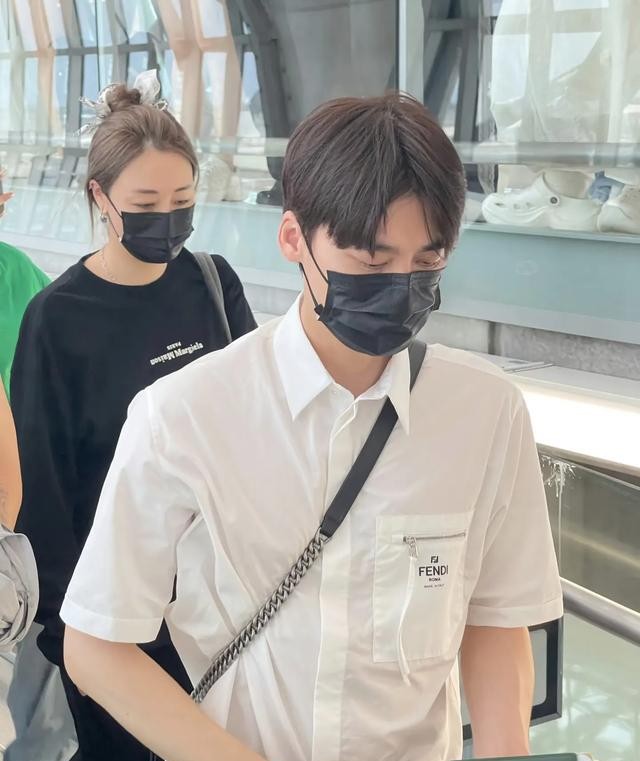 他上半身穿着一件白色衬衫,背着挎肩包,留着中分发型,戴着口罩,这身打扮很清爽,非常显年轻,好像大学生!