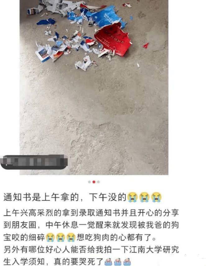 根据网友爆料 ,一名女学生上午刚在朋友圈炫耀自己被江南大学录取了,下午录取通知书就被狗吃了。