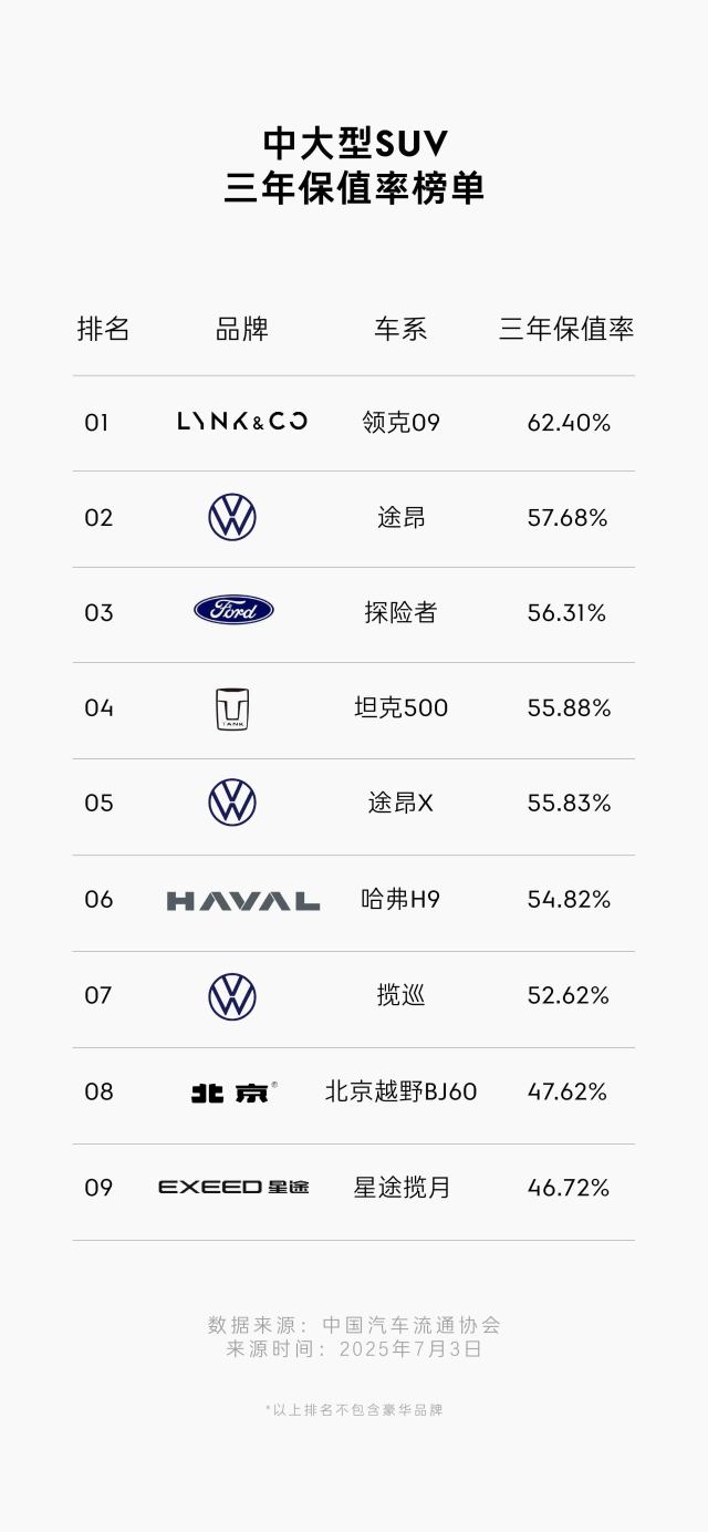 日前,中国汽车流通协会联合精真估发布了《2025上半年中国汽车保值率研究报告》,在这份行业权威数据中,自主品牌领克再度收获亮眼成绩。其中,领克品牌整体三年保值率达54.58%,位列中国自主品牌前三,而领克09更是以62.40%的三年保值率在中大型SUV市场夺得头名。这一表现,显然不是偶然所得,而是领克09在多维度打造产品核心竞争力的结果。