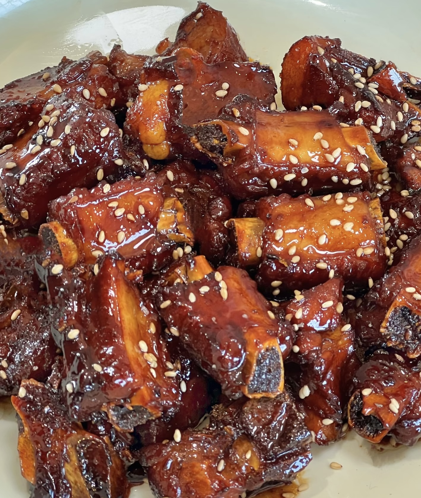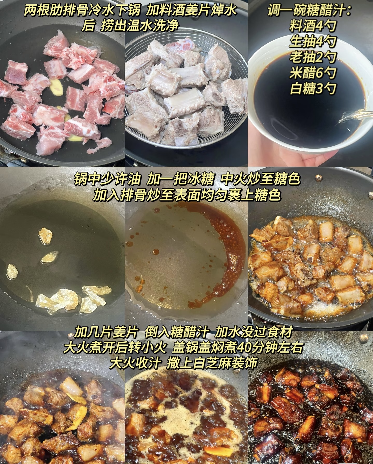 此时捞出香料,转大火收汁,加入提前调好的糖醋汁——通常比例为两勺生抽、三勺香醋、四勺白糖、半碗清水,根据口味微调。汤汁逐渐浓稠,糖醋味愈发浓郁,排骨也由浅褐转为红亮油润。待汤汁收至浓稠、能挂在排骨上时,撒入白芝麻,略翻几下即可出锅。